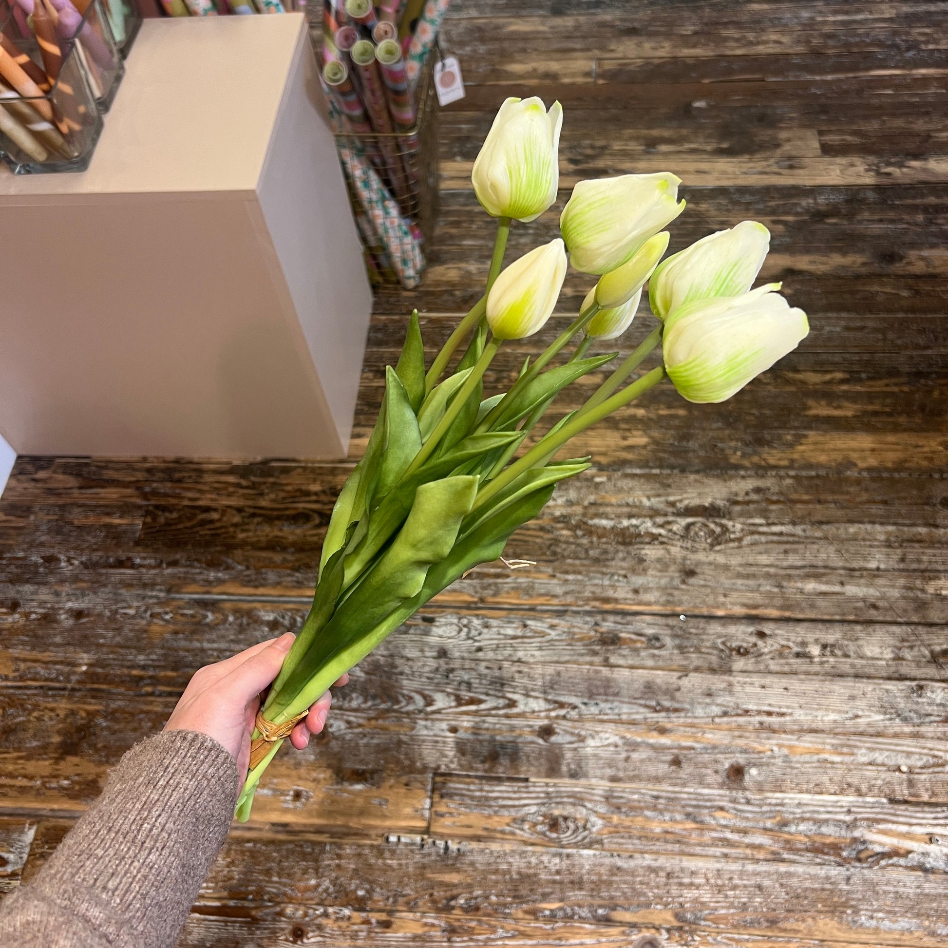 Breng het voorjaar in huis met dit prachtige bosje kunsttulpen. De tulpen zijn bijna niet van echt te onderscheiden. Elk bosje bevat 7 tulpen en heeft een mix van open en dichte bloemen. Ze zijn ca. 47 cm lang en blijven altijd mooi, zonder onderhoud. Perfect voor elk interieur – hier word je blij van!
