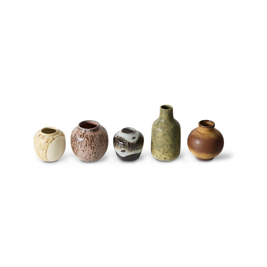 Voeg een vleugje retro charme toe aan je interieur met deze set van 5 keramieken vaasjes, een favoriet uit de iconische 70’s ceramics collectie van HKLIVING. Elke vaas heeft een unieke vorm en een met de hand afgewerkte glazuur, waardoor elk stuk écht one of a kind is. Perfect om losse bloemen in te presenteren of gewoon als decoratief accent. Deze set biedt eindeloze stylingmogelijkheden en brengt warmte en karakter in ieder interieur.