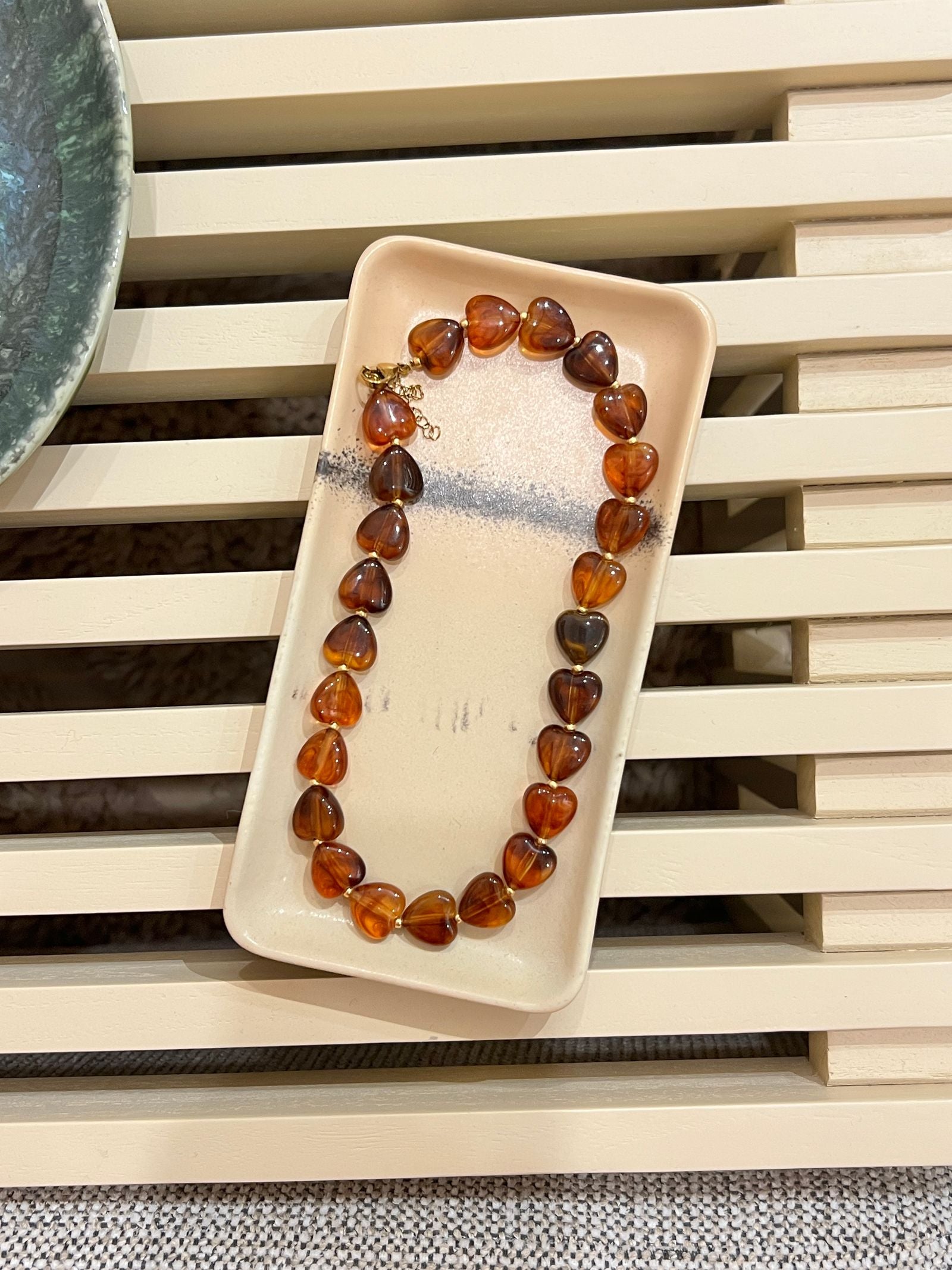 Deze leuke hartjes kralen stelen de show! De kettingen hebben een lengte van ca. 42cm en zijn er in vijf warme kleuren.
