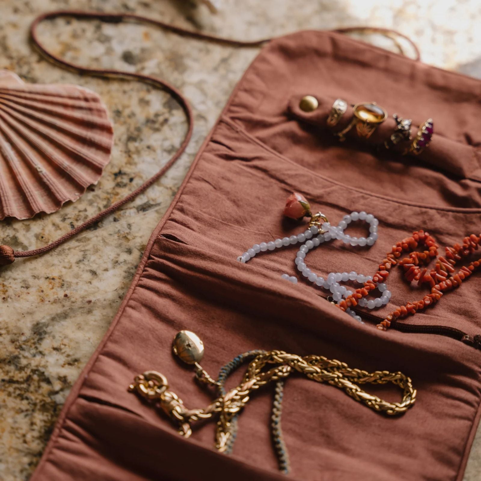 Het is met zorg gemaakt van biologisch katoen en linnen en is daarmee zowel duurzaam als verfijnd. Ontworpen om je favoriete sieraden te beschermen en alles perfect op zijn plaats te houden; een echte must-have voor zowel globetrotters als verzamelaars.