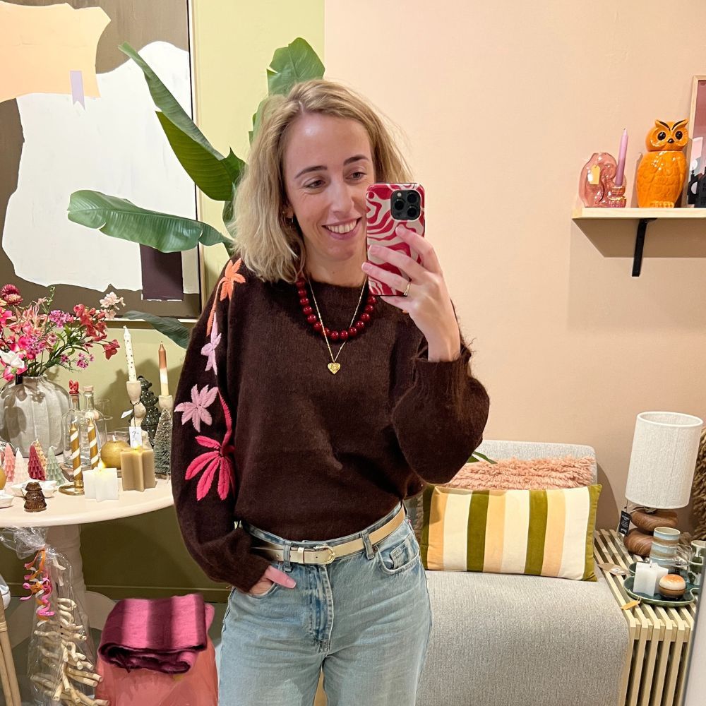 Yes, tijd voor heerlijke truien! De stof is van deze trui is lekker zacht en op de mouwen zit een mooi gekleurd bloemenpatroon.
