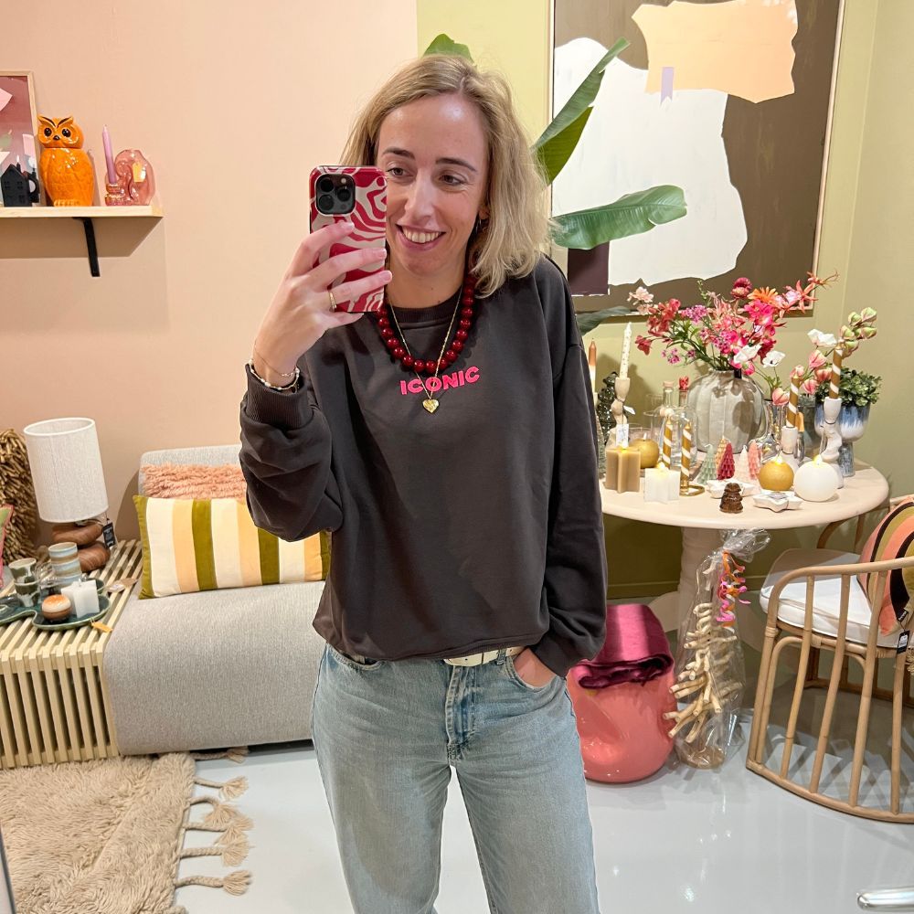 Deze trui is ICONIC. Een heerlijk basic sweater met een kleine opdruk, te leuk! Heerlijk voor een comfy dag op de bank of leuk op een jeans of pantalon voor een dagje kantoor of op stap. Van deze trui ga je heel veel plezier beleven.