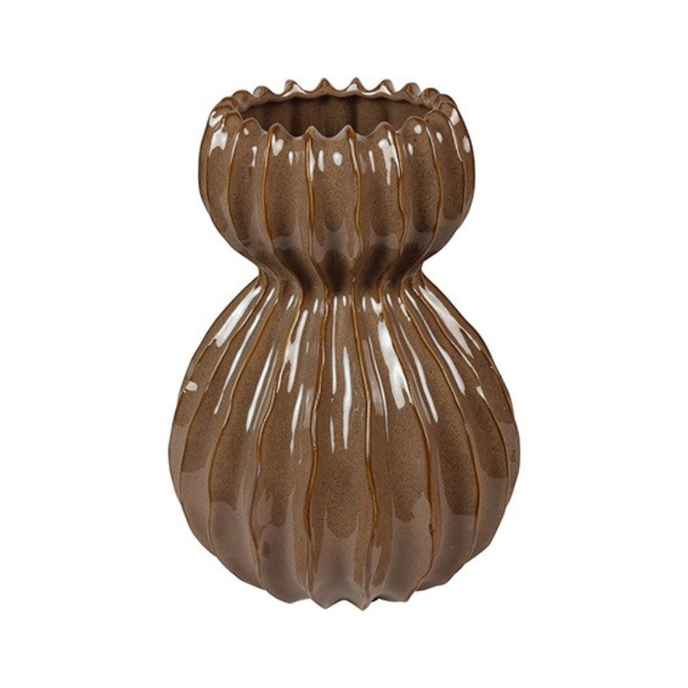 Vaas Lenn is een vaas met een geribbelde, pompoenachtige vorm. De groene kleur en verticale lijnen geven het ontwerp extra diepte. Deze vaas voelt huiselijk en stoer tegelijk en past bij uiteenlopende interieurstijlen. De vaas heeft de kleur bruin met een oudroze gloed.