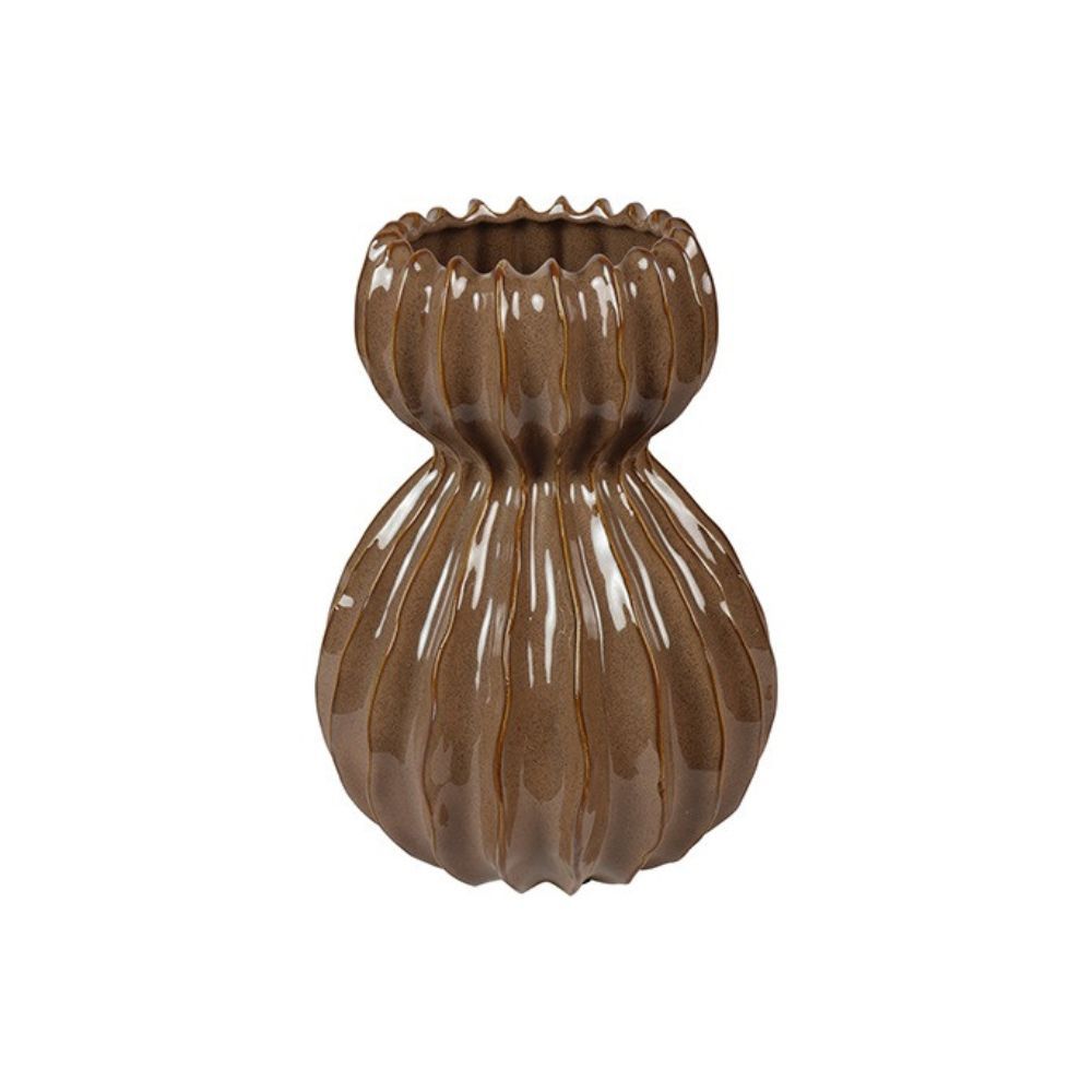 Vaas Lenn is een vaas met een geribbelde, pompoenachtige vorm. De groene kleur en verticale lijnen geven het ontwerp extra diepte. Deze vaas voelt huiselijk en stoer tegelijk en past bij uiteenlopende interieurstijlen. De vaas heeft de kleur bruin met een oudroze gloed.