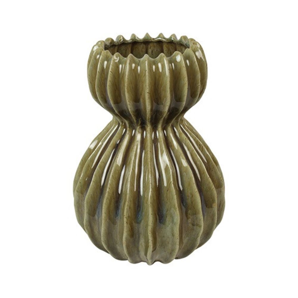 Vaas Lenn is een vaas met een geribbelde, pompoenachtige vorm. De groene kleur en verticale lijnen geven het ontwerp extra diepte. Deze vaas voelt huiselijk en stoer tegelijk en past bij uiteenlopende interieurstijlen.
