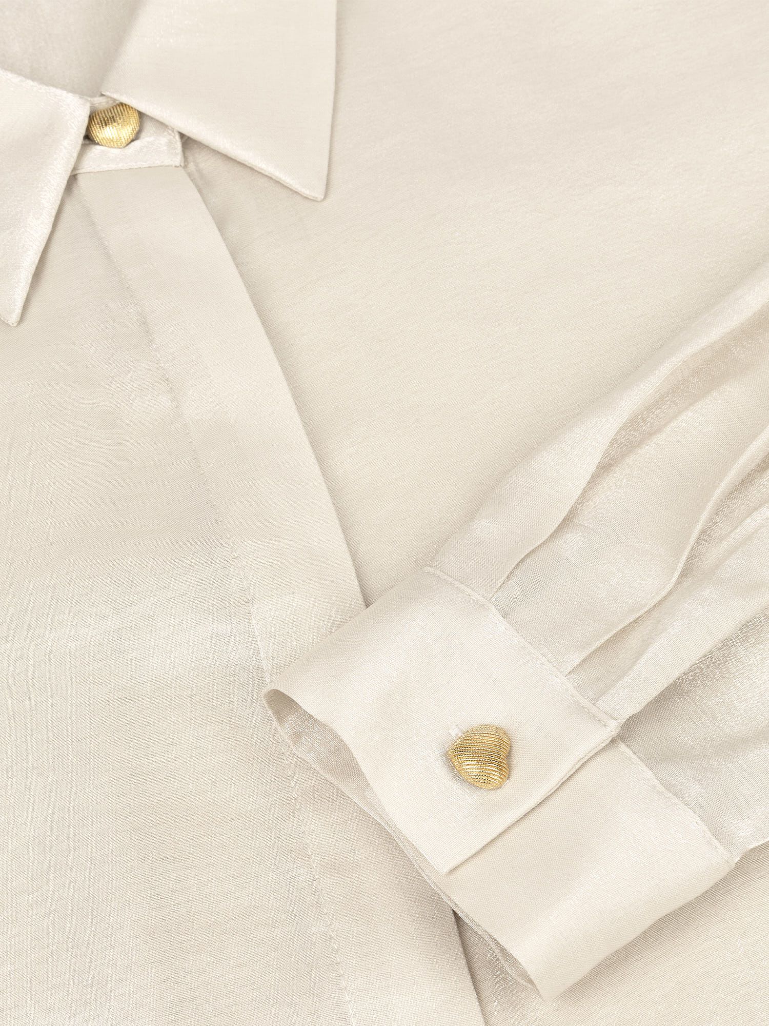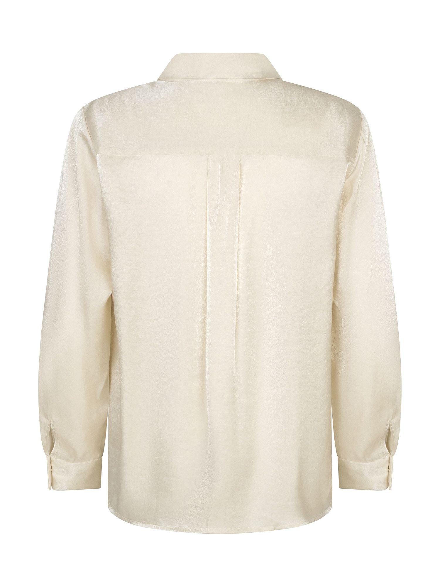 Blouse Lindsey van Ydence is een elegante blouse met een luxueuze glans. De blouse heeft een rechte, lange pasvorm, klassieke kraag en een verborgen knoopsluiting aan de voorkant. De lange mouwen zijn afgewerkt met manchetten en hartjesknopen, waardoor Lindsey zowel zakelijk als feestelijk gedragen kan worden. De mouwlengte is 58,5 cm, de bodylength aan de voorkant 63 cm en aan de achterkant 74 cm bij maat S.