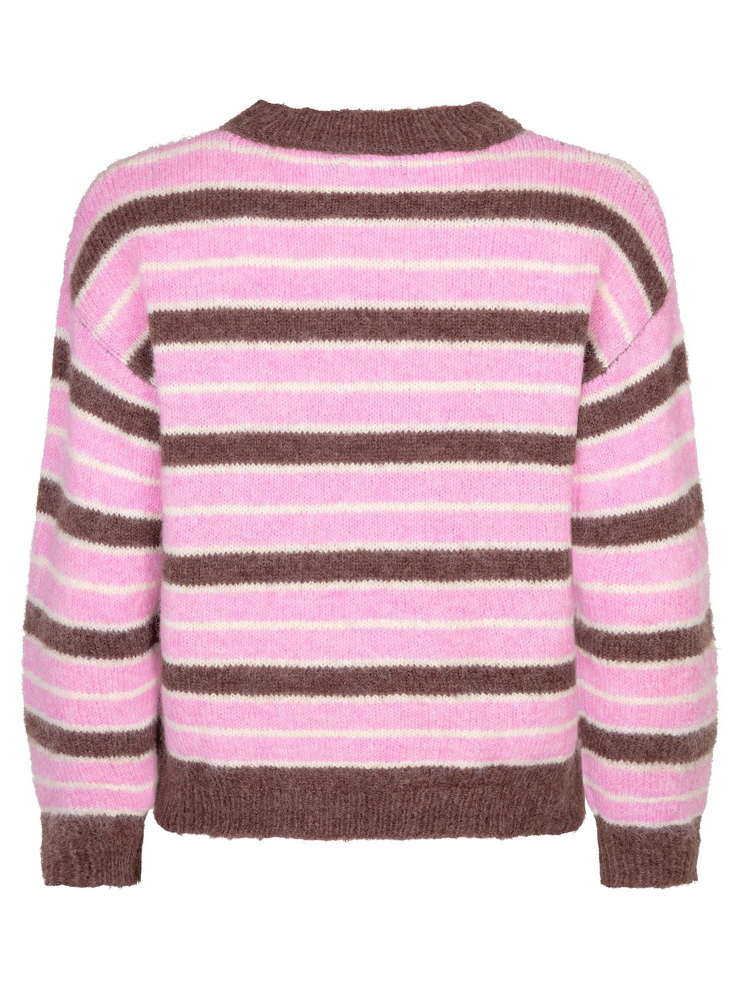 Knitted Sweater Aria van Ydence is een vrolijke en cozy must-have voor de koudere dagen. Deze trui heeft een rechte, iets losse pasvorm en is ontworpen met een speels gestreept patroon in warme tinten rood en fuchsia. De ronde hals en ribboorden zorgen voor een comfortabele fit, terwijl de zachte knitstof heerlijk aanvoelt. Perfect om een kleurrijke touch aan je outfit te geven. De totale lengte van knitted sweater Aria is 57 cm met een mouwlengte van 52 cm bij een maat S.