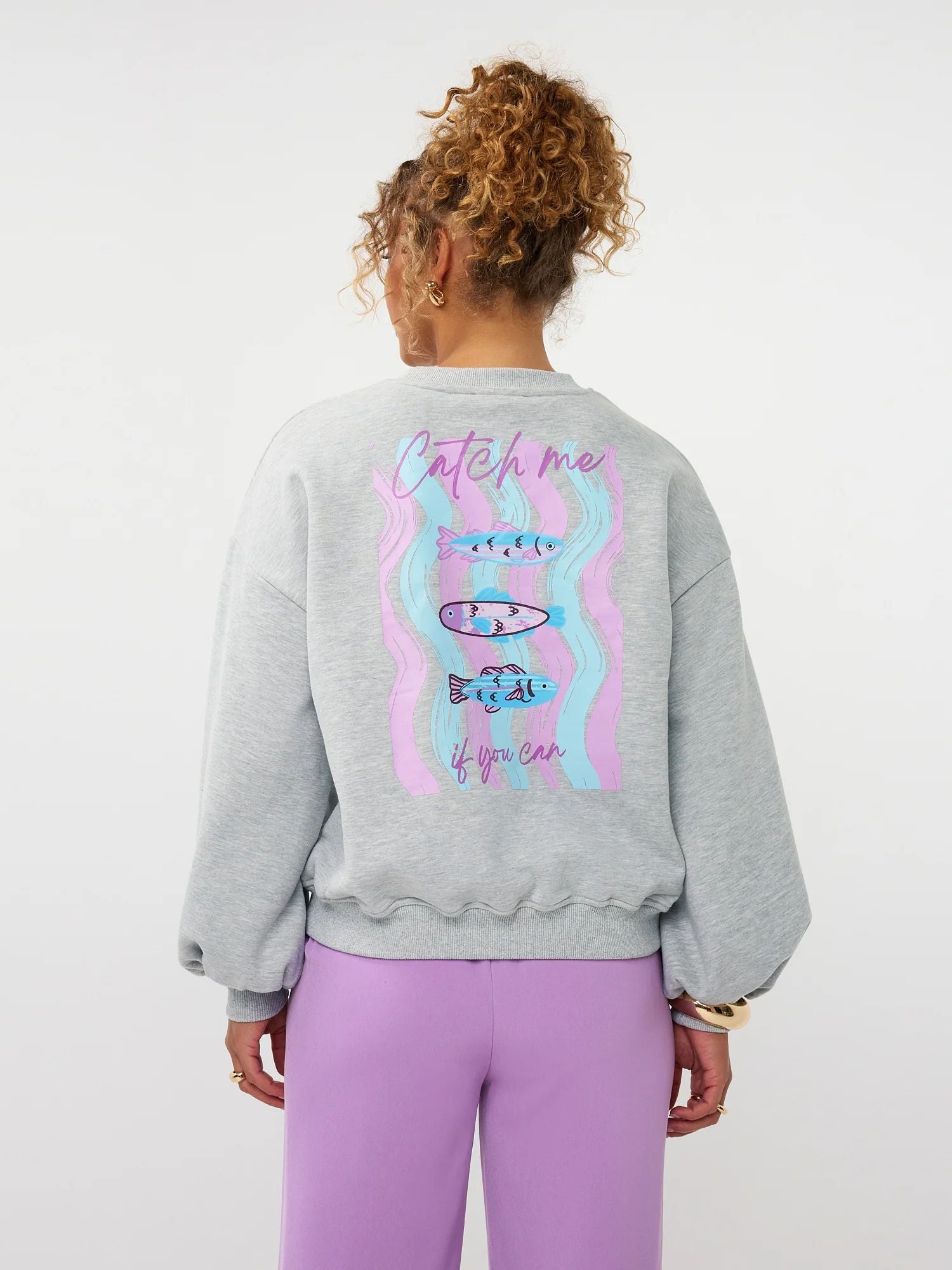 Sweater Catch Me is een comfortabele sweater met een relaxte, iets oversized pasvorm en een zachte feel. Het model heeft een ronde hals, verlaagde schoudernaden en elastische boorden aan de mouwen en zoom. Op de voorkant staat een klein speels visje in frisse pastelkleuren. De echte eyecatcher zit op de achterkant: hier is een grote, kleurrijke backprint te zien met vissen. De print is uitgevoerd in tinten roze, lila, mint en wit en wordt aangevuld met de tekst “Catch me if you can” in een handgeschreven stijl. Dit geeft de sweater een vrolijke, grafische look met een knipoog. De totale lengte van Sweater Catch Me is 61 cm lang en heeft een mouwlengte van 51 cm.
